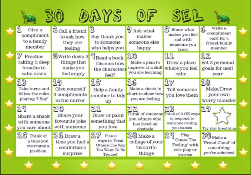 30 days of SEL Home learning well-being pack Primary Well-being booklet Doing 'the turtle' at home Action for Happiness: Meaningful May 2020 ideas SEL activity: Roll with it SEL activity: Brain Breaks (Would I lie to you?) SEL story: Everybody Feels Happy SEL activity: The Worst Witch Self awareness SEL activity: Compliments Action for Happiness: Joyful June 2020 ideas Rainbow activity ideas